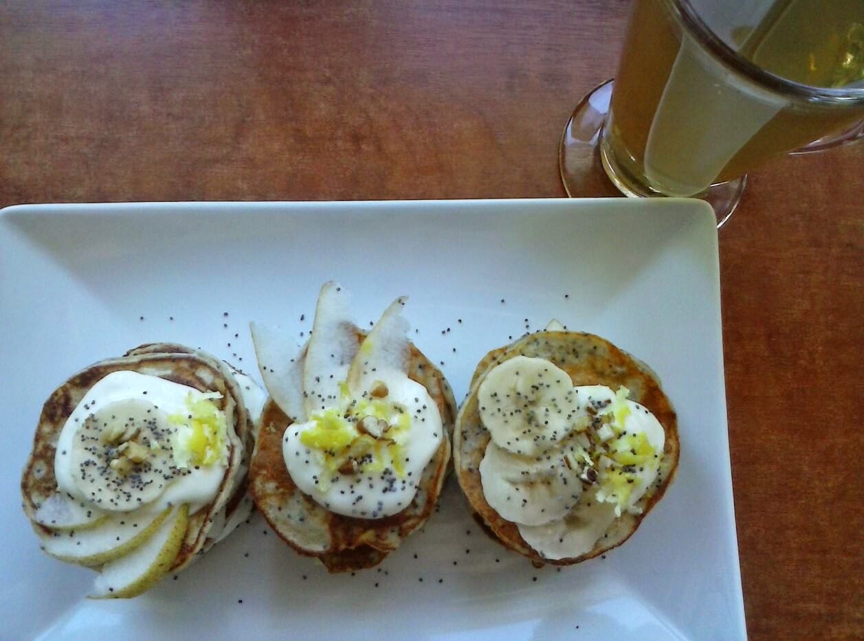 Kakaowo-orzechowy placek owsiany podany z twarożkiem* bananem, jagodami, startą gorzką czekoladą i orzechami laskowymi i nerkowca, herbata Sekret Esmeraldy z domowym sokiem malinowym i miodem *twaróg wymieszany z jogurtem naturalnym i miodem |
